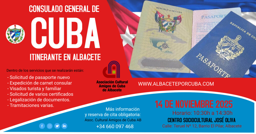 El Consulado General de Cuba en Madrid, en coordinación con nuestra Asociación Cultural “Amigos de Cuba” de Albacete, ha confirmado la realización de un Consulado Itinerante en la ciudad de Albacete, el viernes 14 de noviembre de 2025, con el objetivo de facilitar la atención y tramitación de servicios consulares a los ciudadanos cubanos residentes en la provincia y en la región de Castilla-La Mancha, evitando así desplazamientos hasta la capital española.
